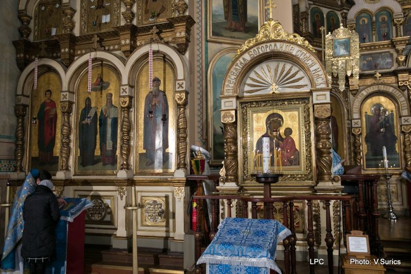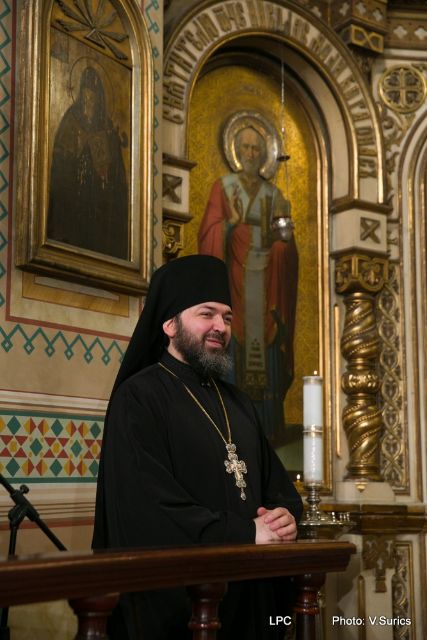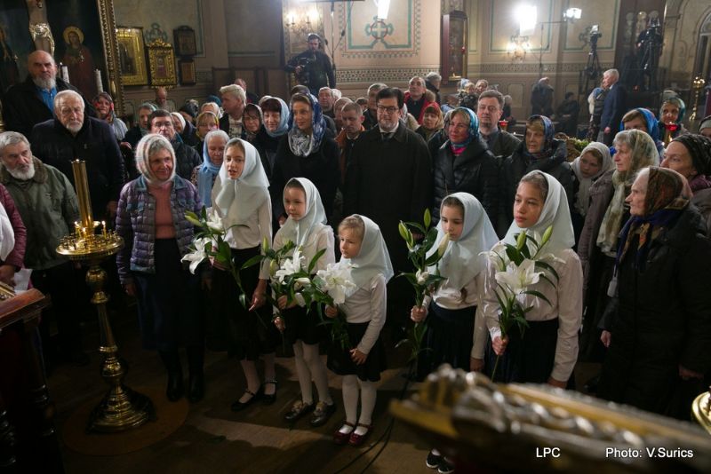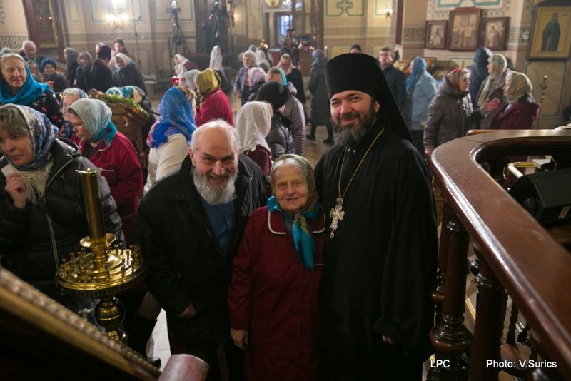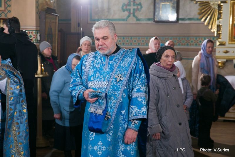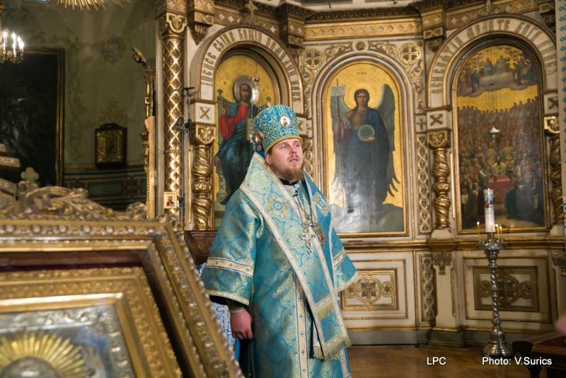 Преосвященнейшему Владыке сослужили: Рижскоградский благочинный митрофорный протоиерей Иаков Присяжнюк, настоятель Рижского Всехсвятского храма и духовник РДС игумен Макарий (Кириллов), клирик Иоанно-Предтеченского храма г. Риги преподаватель РДС иеродиакон Герман (Карташов) и клирик Всехсвятского храма диакон Николай Анусевич. Во время литургии были провозглашены особые прошения о сохранении единства и мира в Православной Церкви и о прекращении смуты на Украинской земле. По окончании Божественной литургии был совершён молебен и прочтена молитва Пресвятой Богородице.