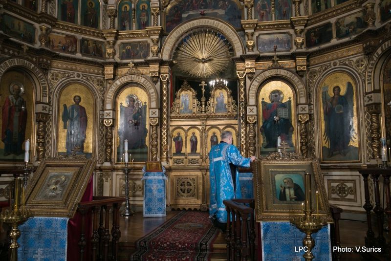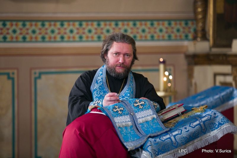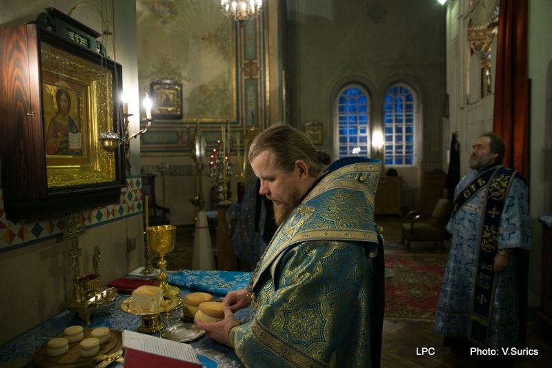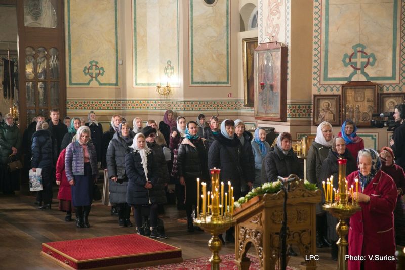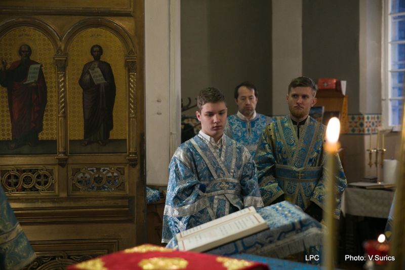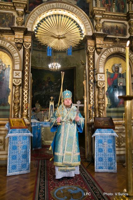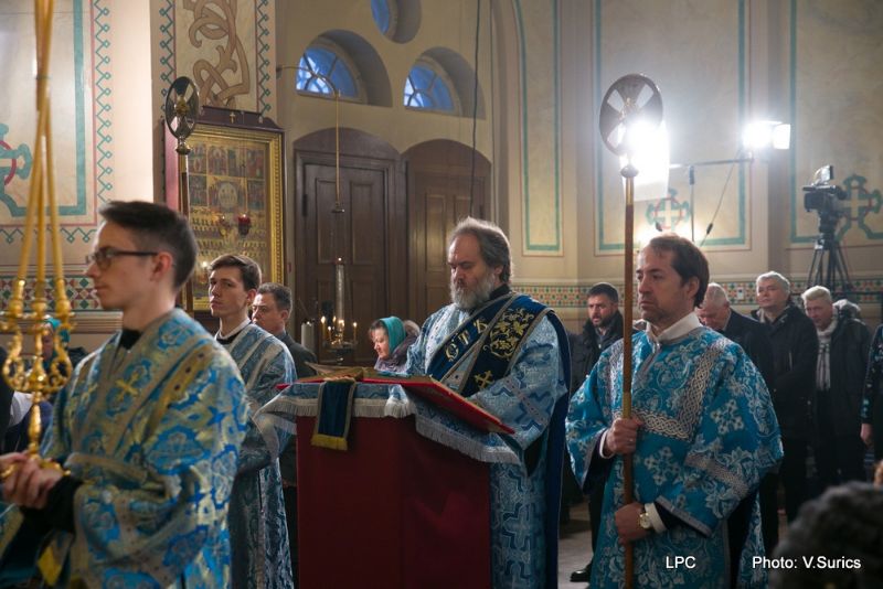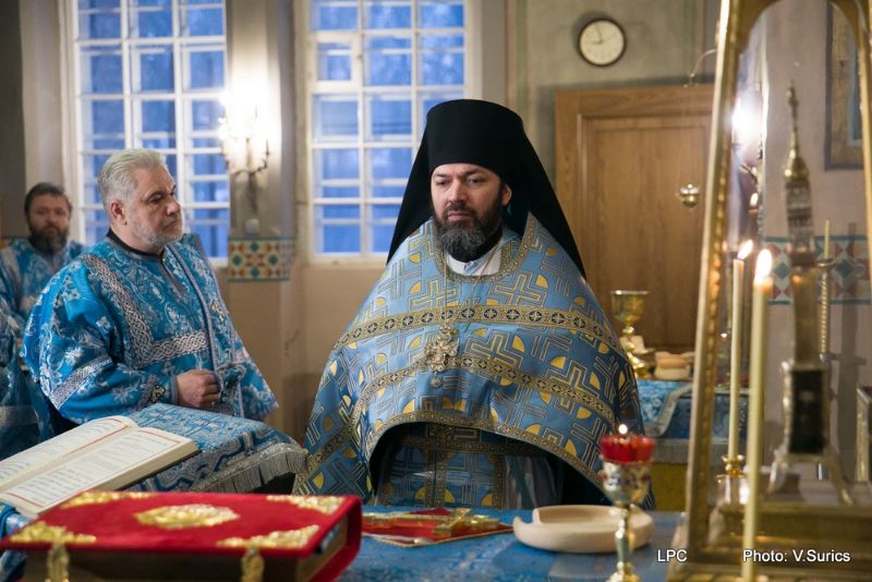 Преосвященнейшему Владыке сослужили: Рижскоградский благочинный митрофорный протоиерей Иаков Присяжнюк, настоятель Рижского Всехсвятского храма и духовник РДС игумен Макарий (Кириллов), клирик Иоанно-Предтеченского храма г. Риги преподаватель РДС иеродиакон Герман (Карташов) и клирик Всехсвятского храма диакон Николай Анусевич. Во время литургии были провозглашены особые прошения о сохранении единства и мира в Православной Церкви и о прекращении смуты на Украинской земле. По окончании Божественной литургии был совершён молебен и прочтена молитва Пресвятой Богородице.